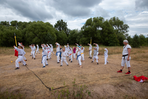 Возле кухни – всегда движение. Вот и сейчас идёт дымок от костра, на огне готовится борщ. Дежурные под руководством мам Натальи Ситовой и Полины Курич колют дрова, чистят картошку и чеснок, готовят тарелки. Главным поваром оказался Антон Ильчук, папа Вани. Признался, что сын учит его некоторым приемам, однако пока он научился только «держать планочку». Оба идут по нашей просьбе на показательные упражнения. Ваня показывает ката «Канку Дай», а потом с папой – ту самую «планочку».