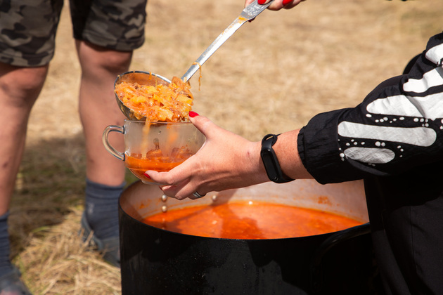 Нам удалось попробовать обеденного борща, приготовленного на костре. С поджаренными ломтями черного хлеба, натертыми чесноком. Очень вкусно! Тем, у кого хороший аппетит, предлагают добавки.
