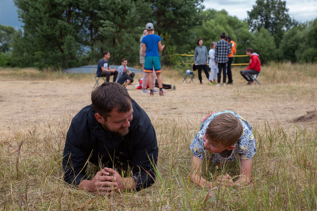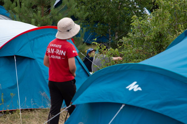 - Пребывание на природе вносит коррективы в распорядок жизни, - говорит Александр Кузьмин. - В сильную жару мы больше стараемся детей купать, а не тренировать. По три раза в день водим их купаться в озере. Место хорошее – заход по колено, а потом по грудь. Дно песчаное. Для детей отлично! Место, кстати, подсказали родители. И в дождь стараемся их развлечь. Но бывают специальные тренировки под дождем – для тех, кто постарше.