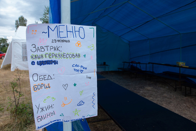 В день нашего визита ребята занимались презентацией отряда и репетицией музыкального поздравления для тренера. Он родился 29 февраля, что бывает раз в четыре года, вот и решили отметить его день рождения летом. После 17 часов - игры в пионербол, вышибалы, стрельба из лука, купание и катание на байдарках. В 19.30 - ужин. В шатре у кинопроектора - показ кино и мультфильмов и время творческих выступлений. В 22.00 - отбой.