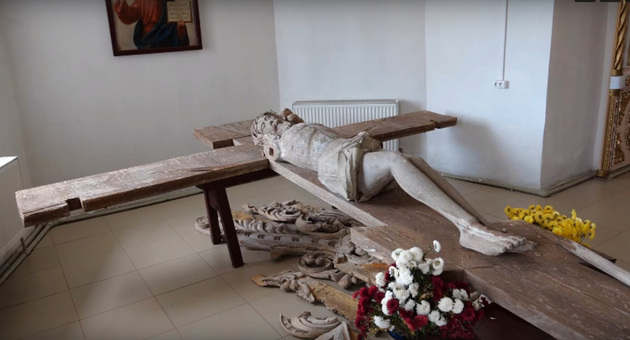 В безбожное время этот крест неоднократно пытались снять и повредили руки Спасителю. В 1936 году Воскресенскую церковь закрыли: всё ценное из неё было вывезено, святыни поруганы, а колокола сброшены и разбиты. Оставалось только это распятие, возвышавшееся над иконостасом.