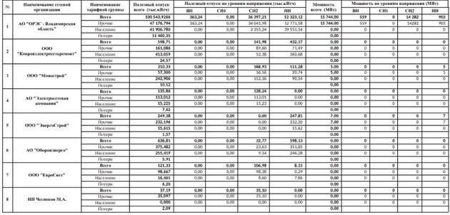 Примечание: полезный отпуск электрической энергии из электрических сетей сетевых организаций указан суммарно по точкам поставки, соответствующим зоне деятельности АО «Владимирские коммунальные системы» как гарантирующего поставщика и как независимой энергосбытовой организации.