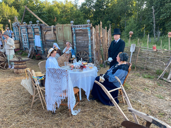 На реконструкцию, над идеей которой Мостовой и его единомышленники трудились неделями и которую сооружали в выбранном месте несколько дней, ковровчане и владимирцы приезжали целыми семьями — самые предусмотрительные с корзинками для пикника, пледами и большими зонтами (от солнцепека) и, угощаясь мороженым, любовались на катание актеров на лодочках по Нерехте, аутентичные деревенские качели, где главный элемент — крупная доска, церемонное чаепитие в барском доме , качание колыбельки и ткание половичков в крестьянских избах, всевозможные лавочки — где мастера плетут изделия из лозы, точат и куют орудия труда, «торгуют» изделиями из чугуна и дерева. Песни и хороводы на этой реконструкции тоже были — плюс «живой уголок» с ласковыми козами, коровами и лошадьми, с которыми все желающие могли сфотографироваться. Особенно этой возможности радовались дети.