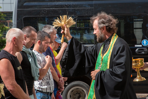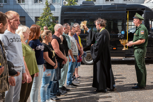 ...Церемония отправки завершилась благословением добровольцев на воинскую службу от священника отца Владимира. Батюшка окропил их святой водой. В автобус добровольцы усаживались под мелодию марша «Прощание славянки».