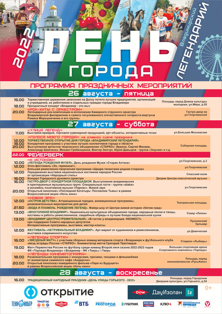 В это же время на стадионе “Лыбедь” пройдут спортивные мероприятия. Откроется программа звездным матчем с участием ветеранов владимирского футбола и звёзд российской эстрады “Старко”. Комментировать встречу будет известный журналист Григорий Твалтвадзе. Сразу после владимирское “Торпедо” примет на своем стадионе ФК “Тверь”.