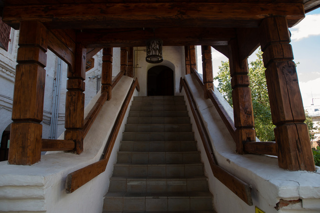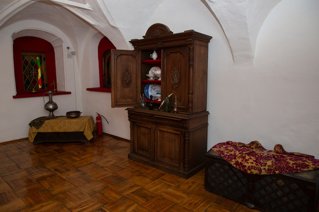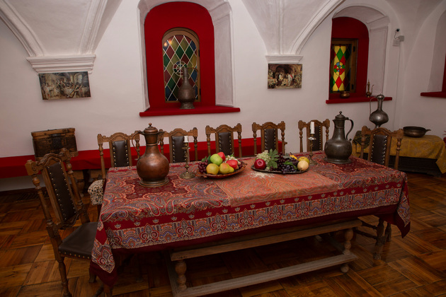 На второй этаж мы спускаемся по опасной лестнице, у которой все ступени разной высоты. Почему так? Есть несколько версий: «Когда в дом пробирался враг, он не знал высоты ступеней, поэтому мог споткнуться и упасть, поднять шум. Также раньше при строительстве домов не было рулеток, линеек и прочих инструментов. Рука и ладонь - вся система измерения. Именно из-за этого ступеньки могли получиться непропорциональными. Наш персонал привык, знаем, где больше шаг сделать, а где меньше», – отметила ведущий специалист музея Виталия Наджафова.