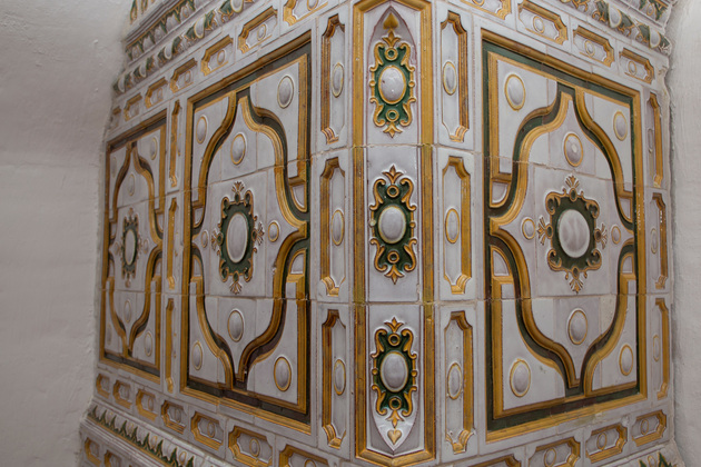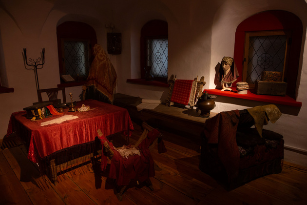 Эта часть музея рассказывает историю, когда домом владел Семен Ершов. Кстати, за купцом числилось два особняка в городе, во втором организовали одноименную гостиницу на центральной площади. На втором этаже можно увидеть отличительные элементы архитектуры XVII века – сводчатые потолки, бестолпное арочное строение, небольшие полукруглые окна, снаружи украшенные каменными наличниками… Экскурсовод ведет нас в сени – хозяйственное помещение, откуда раньше отапливали печь. Устье печи отапливало сразу две комнаты – хозяйки и хозяина. За счет того, что воздуховод был внутри стены, дополнительно отапливался третий этаж. В 80-х годах прошлого столетия была выполнена реконструкция печей. Еще одна печь отапливала «красную палату», но она не сохранилась до нашего времени. Сейчас в музее обустроено центральное отопление, а батареи спрятаны.