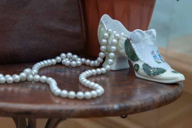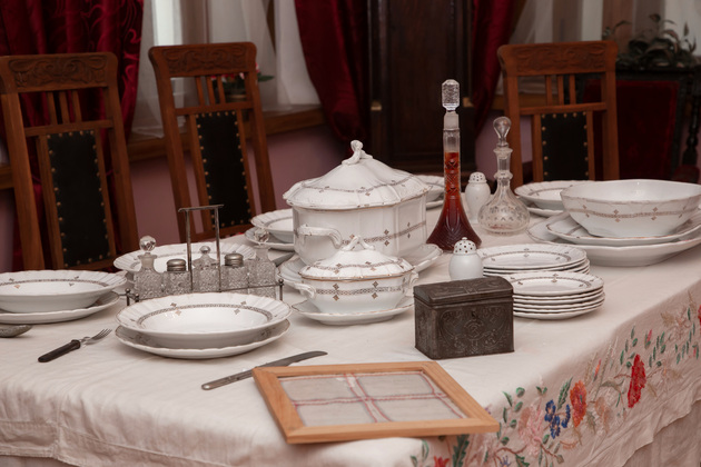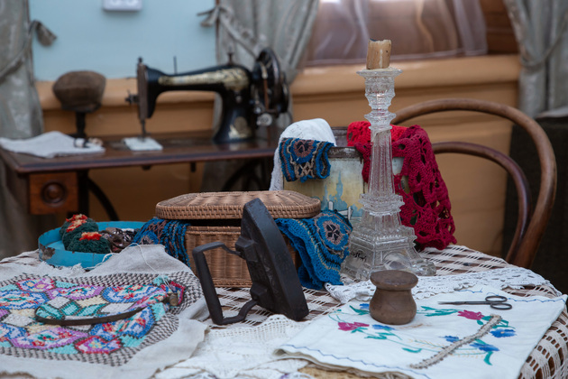Оказывается, Секлетея жила в доме во времена «коммуналок» еще с 7 семьями. В бывшей обители племянницы нынче воссоздана обстановка женской комнаты. До наших времен там сохранилась оригинальная лепнина под потолком и деревянные панели под окнами. В экспозиции представлены вещи, принадлежащие семье Сапожниковых, – швейная машина фирмы «Зингер» (подарок Михаила Сапожникова в день свадьбы), флаконы духов, фрагменты вышивок на столе и подсвечник в виде Эйфелевой башни.