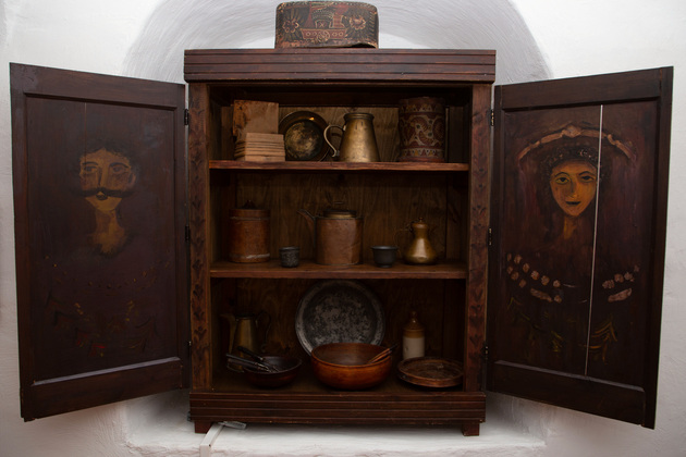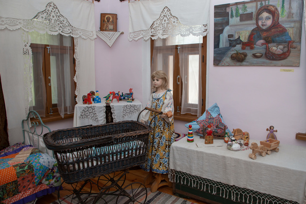 Взгляд приковывает украшенный золотным шитьем головной убор замужней женщины – кика. Еще из интересного – самовар-кухня, который позволял одновременно готовить сразу два блюда. В комнате также представлен шкаф-поставец с медной посудой внутри, которая была признаком достатка купца. Крестьяне обычно ели из глиняной или деревянной посуды.