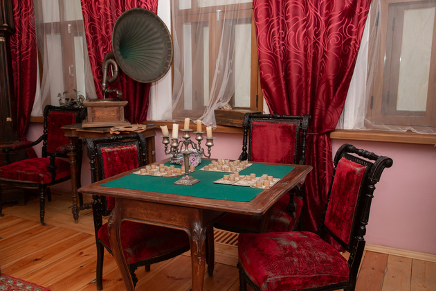 Переходим в «красную палату». В этой комнате все обито красным сукном, что придает помещению особое праздничное настроение. Есть версия, что потолок мог быть украшен рисунком звездного неба, а окна обтянуты слюдой. Стекло было очень дорогим, и купцы считали непозволительной роскошью тратиться на него. Если погасить свет, то в комнате достаточно темно, с улицы все ставни закрыты. Как правило, здесь купец принимал именитых гостей. Во главе стола садился хозяин дома, а затем по старшинству и степени родства усаживались все гости. Еда, которую подавали, готовилась в поварне. Напротив – комната хозяйки. Интересно, что она соединена с соседней – хозяина – дверью.