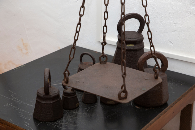 В погребе (подклете) представлены предметы быта разных эпох – от XVII до XX века. Большие бочки для хранения товаров, корыта для рубки жестких овощей, тяпка, ухват для чугунков, коромысло, лучина для освещения помещений... Во второй части помещения - большие торговые весы для сыпучих товаров. В комнате есть все для работы в поле и на кухне – вилы, серпы, грабли, борона, жернова, маслобойка, просорушка, ступа и мялка для льна. Виталия обращает внимание на рукомойник, его раньше вешали при входе в дом, а вниз ставили лохань. Самый громоздкий экспонат в погребе – старинный комбайн. Внутри находится металлический жезл, за счет его вращения измельчались продукты. Функционал у этой вещи большой: мясорубка, соковыжималка и т. п.