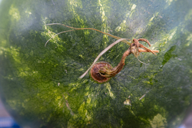 Оказывается, одним из секретов спелого арбуза является светлое пятно на боку, которое «отлежал» плод. Пятнышко должно быть максимально желтого оттенка, или даже оранжевого. Можно проверить дедовским способом: если ноготь легко протыкает корку, значит, перед вами незрелый плод. Поверхность арбуза должна быть твердой, блестящей и иметь целостный покров. Не забываем, что усик и плодоножка у зрелого арбуза сухие!