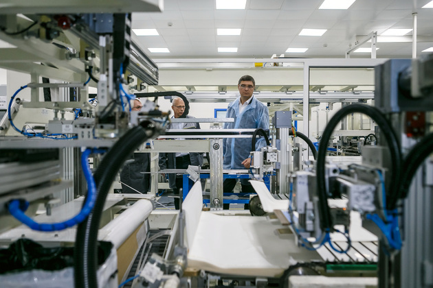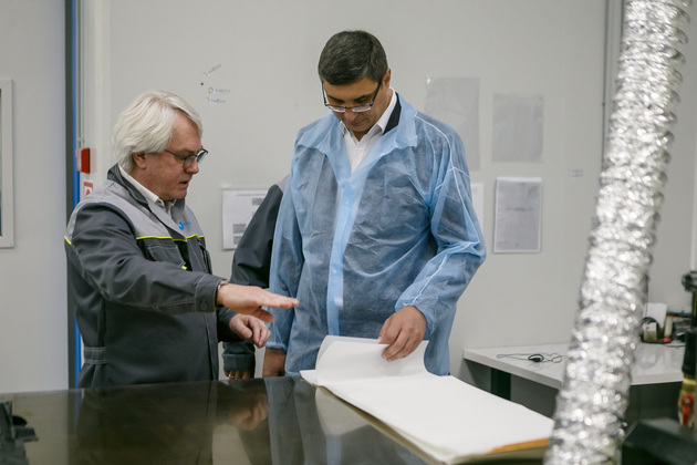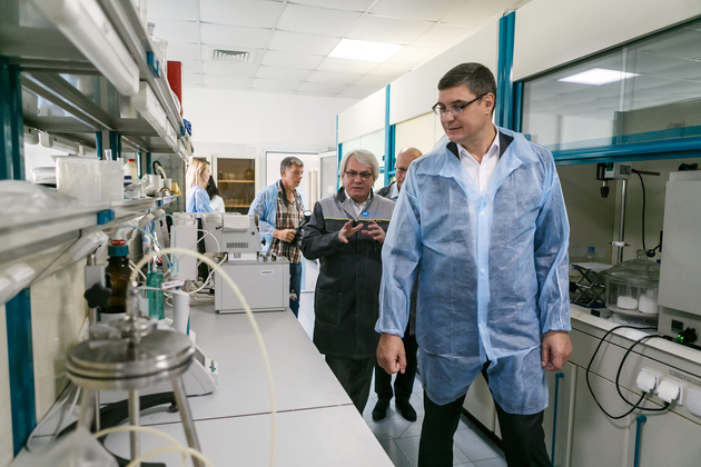 Генеральный директор АО «Полимерсинтез», член Совета директоров АО «РМ Нанотех» Иван Баженов провел Александра Авдеева по производству и объяснил, почему именно Владимир достоин создания такого центра: