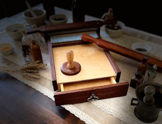 Выглядит пилюльная машина как некий деревянный ящичек с режущими поверхностями (резаками), дощечкой для выкатывания стержня и ролика для округления нарезанных пилюль.