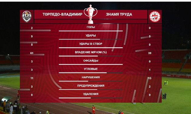 Александр Горбачев пожелал своей команды лучшей реализации голевых моментов и остался доволен действиями своей команды в обороне. Статистика матча показала, что по всем основным параметрам: владение мячом, угловые, удары по воротам торпедовцы опередили гостей. Со стороны игроков «Знамени Труда» даже не было зафиксировано ни одного удара в створ ворот владимирской команды. Так что результат – кубковая победа – вполне заслуженный.
