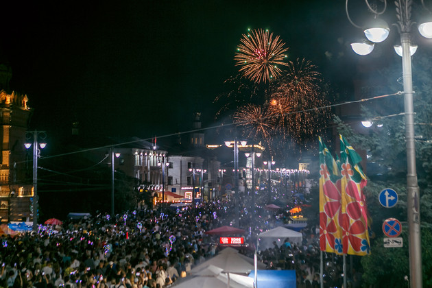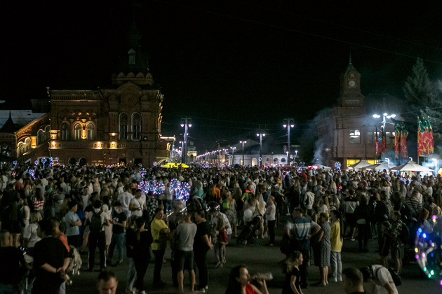 Когда на улице стемнело, люди стали стягиваться к главной сцене. За ней завис большой воздушный шар. Выступали Иракли, Виктор Зинчук, Сергей Минаев, Сергей Крылов, Михаил Гребенщиков, Александр Шевченко, Юрий Давыдов, группа «Зодчие». Кто-то забеспоколился — а когда салют? Зря волновались — ровно в 22:00 небо озарили залпы впечатляющего 7-минутного фейерверка.