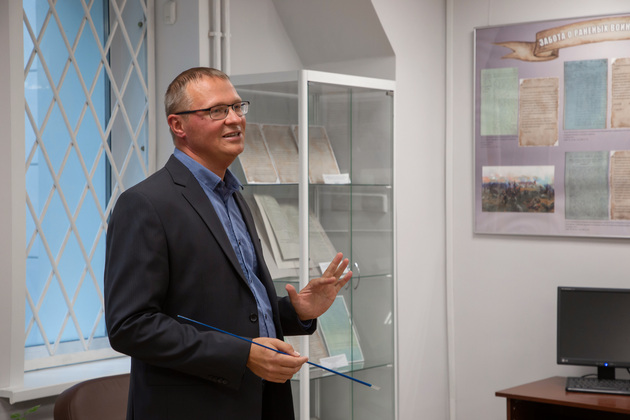 Заведующий сектором информационно-выставочной работы Госархива области Алексей Арескин провел увлекательную экскурсию по экспозиции.