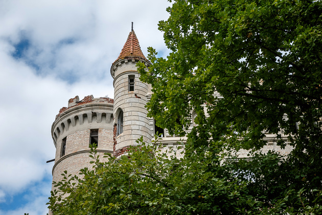 Юго-западная часть, выстроенная в 1884–1889 годах, более камерная - с башней входа и островерхими кровлями. Её прообразом послужили французские замки - светлые оштукатуренные полосы и открытая кирпичная кладка стен чередовались, придавая облику еще большую «историчность».