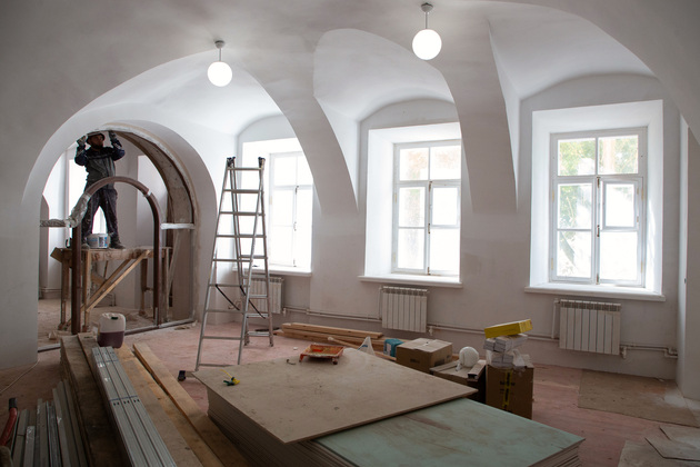 Фасады дома уже обновлены, а внутри еще трудятся реставраторы. Мы сразу поднимаемся в главный парадный зал. Он удачно отделен от анфилады личных комнат, куда гости не проходили. Скажем сказу, это лишь одно из многочисленных имений Голицыных в России. Однако одно из самых «продвинутых» и приближенных к столичному уровню в губернии. Во время войны 1812 года оно было, скорее, сельской резиденцией княжеского рода, чем-то вроде загородной дачи.