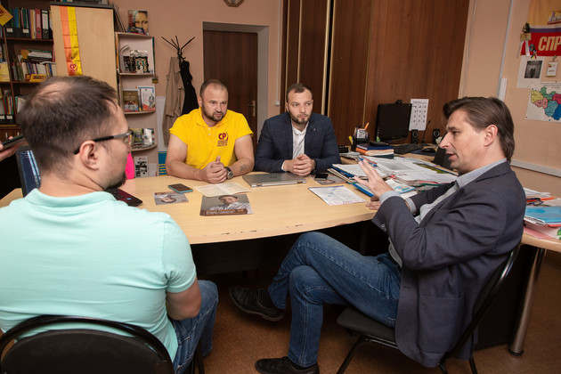 Проголосовав, Субботин отправился объезжать участки, а мы решили заглянуть в избирательный штаб кандидата от «Справедливой России» Сергея Бирюкова. Там шла оперативка: обсуждали информацию от наблюдателей с избирательных участков, оценивали явку.
