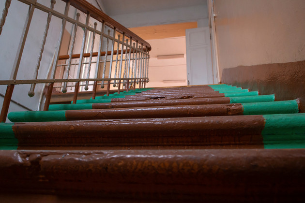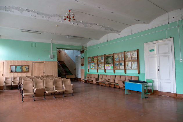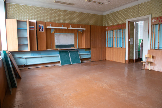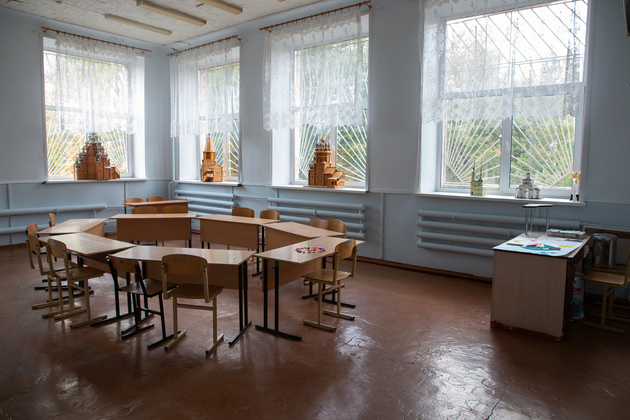 Из плюсов — высокие потолки и пластиковые окна (хотя, учитывая статус архитектурной ценности, они не очень вписываются в ансамбль здания конца девятнадцатого века). Но все остальное — минусы. Очень холодно, несмотря на современные окна. Отопление-то здесь печное. Причем, как нам потом рассказали, при резких перепадах температур - похолодании, обогреть школу все равно не получалось даже с круглосуточным отопом... И то, что нормального ремонта с адекватным финансированием тут не было целую эпоху, видно невооруженным глазом: на полах (в основном дощатых деревянных), дверях, стенах и встроенных шкафчиках - по десять слоев дешевой облупившейся краски. Вдавленные ступени на лестнице. Про состояние санузлов вообще молчу. Из-под плинтусов торчат провода, «загнанные» под них, наверное, еще при Брежневе... Честно говоря, нам даже представить себе страшно, во сколько может обойтись реконструкция трех этих зданий, включая, конечно и прежде всего, замечательный храм.