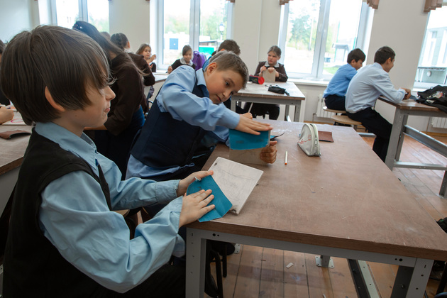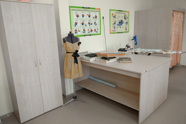 Здесь есть кабинеты музыки, ИЗО, робототехники, информатики, технологии (или, как говорили раньше, «труда»). В «трудовых» классах чего только нет — от токарных и ткацких станков до отличных электрических швейных машинок на каждом учебном месте и полного комплекта полноценных кухонь (это для обучения кулинарии). На момент нашего прихода дети под присмотром преподавателя Матвея Сергеевича мастерили что-то за столами. Присматриваемся к ближайшему столику девочек — разрисовывают дощечки. «Почему у одних контурные рисунки, а у других — раскрашенные?» «Некоторые решили, что вместо выжигания лучше разрисуют, я не возражаю, это тоже творчество», - улыбнулся учитель.
