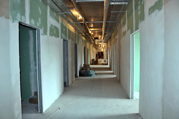 Сейчас здесь завершаются фасадные работы, идет отделка помещений и прокладка инженерных коммуникаций. Подрядчик привлёк пять субподрядчиков, и теперь ежедневно на объекте занято до 280 человек. Стройматериалами они обеспечены в достаточном объеме.