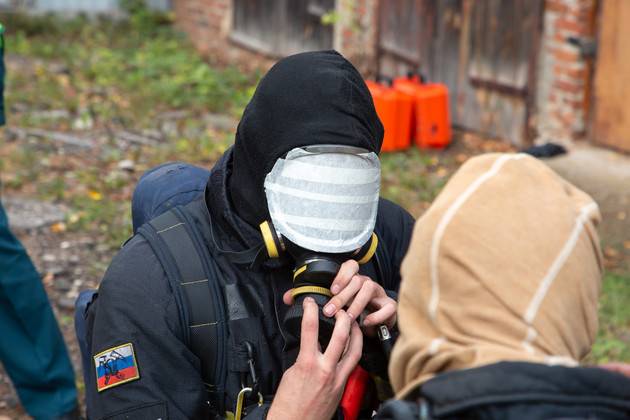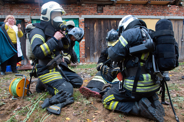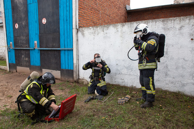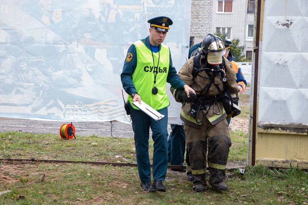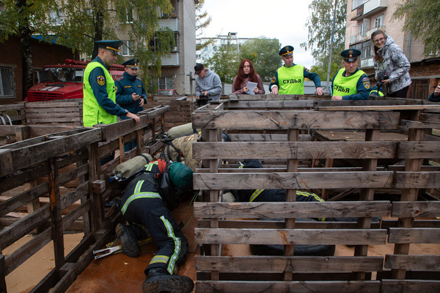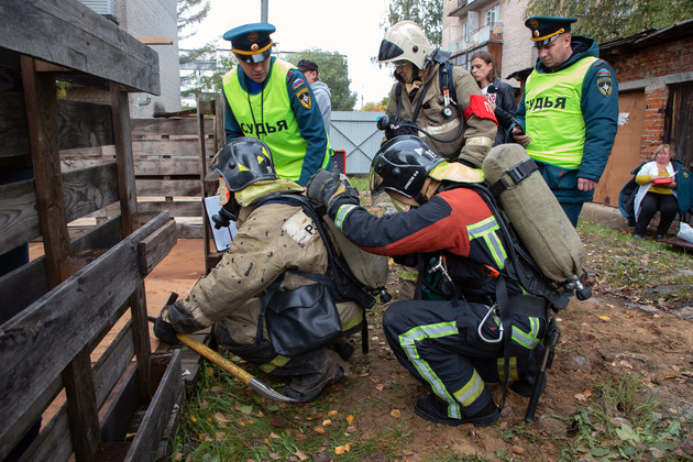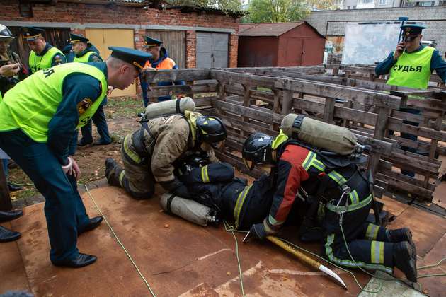 Как нам на старте соревнований пояснил Евгений Горбунов, старший помощник начальника дежурной смены службы пожаротушения ГУ МЧС по Владимирской области, участвуют 9 команд со всей области. В каждом звене — по 4 человека. Один - «постовой», он смотрит за тросом, рассчитывает остатки кислорода в баллонах и отвечает за связь с группой по рации (но направлять спасателей, помогать им не может, потому что, подразумевается, остается снаружи и тоже не знает планировки помещений). Второй - «пострадавший», кого как раз надо найти. Он «где-то внутри» без сознания, с заканчивающимся в баллоне кислородом и полностью заклеенным визором на каске (так имитируют полное отсутствие видимости). Еще двое — тоже с запечатанными визорами, и вот как раз им в полной выкладке нужно ползком обследовать объект и найти сначала пять подающих сигнал маячков, а потом - и товарища. Пострадавший тоже никак не помогает, так что тащить его нужно двойке, которая в процессе слепого обследования незнакомых помещений должна ничего не пропустить, не пострадать сама и успеть либо вытащить человека до того, как у него закончится кислород, либо подключить к своему дыхательному аппарату, доволочь до выхода и оказать первую помощь.