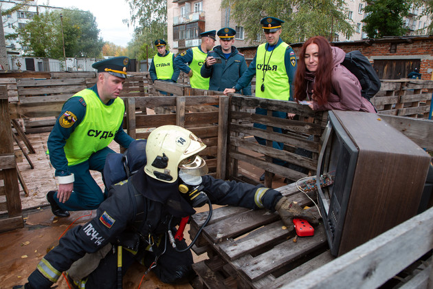 Еще огнеборцев учат не разрывать звено — то есть в сильно задымленных помещениях держаться за любой предмет амуниции или ногу товарища, потому что трос — только у одного в звене (по нему можно найти дорогу назад при дезориентации), а потерять в огне напарника для этих людей — недопустимо. Но на случай, если все же кто-то из звена из горящего здания не вышел, отбившись от группы, есть алгоритм его поиска и спасения. И нам его показали — на базе пожарно-спасательной части №1 города Владимира, на соревнованиях по определению лучшего звена по аварийной разведке и спасению самих пожарных из условно горящих и сильно задымленных зданий.