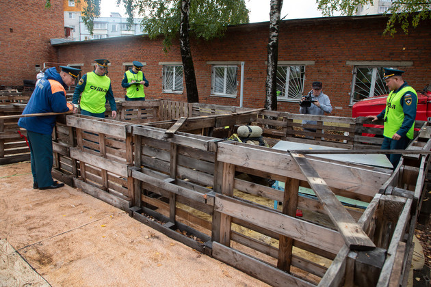 Максимум допустимого на все задачи времени у каждого звена - не более 20 минут. Нюанс в том, что планировки затейливо смоделированного объекта с закутками из досок ребята не знают. Их запускают на площадку только на старте. И тех, кто заходит внутрь, заводят к ней с уже заклеенными визорами. То есть - имитацией полного задымления при отсутствии видимости. Кстати, когда командир одного из ожидающих звеньев зашел на площадку, его подопечным тут же выписали штраф, хотя они еще даже не вышли на старт.