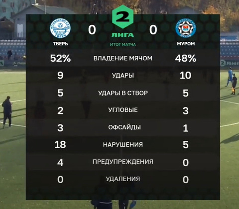 Добавлю, что футболисты «Твери» в течение встречи много фолили, совершив 18 нарушений и набрав 3 желтые карточки. «Муром» играл намного чище, нарушил правила всего пять раз.