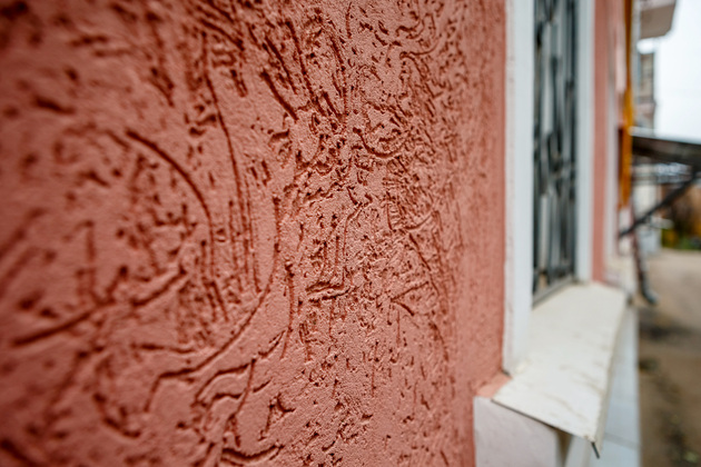 Завершающим аккордом стала новая штукатурка с необычной декоративной фактурой. Это покрытие называется «Короед». Новая штукатурка имеет ощутимые преимущества перед обычной: она более прочная, надежно защищает стены от намокания и внешний вид у нее выигрышный. За счет полимерных добавок она устойчива к перепаду наружных температур и не образует микротрещин, в которых может собираться вода, при замерзании разрушающая штукатурный слой.
