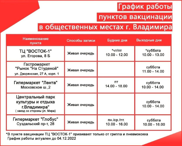- Пункты вакцинации работают по субботам во всех городских поликлиниках Владимира, - говорит Елена Васильевна. - К тому же есть общественные пункты вакцинации, есть график, который можно посмотреть на сайте департамента здравоохранения. Вирус мутирует. Вакцинироваться надо, прививочную компанию никто не отменял. Если человек переболел ковидом, то необходимо делать ревакцинацию через полгода. Коллективного иммунитета у нас, к сожалению, нет. Для этого нужно, чтобы 70% населения было привито.