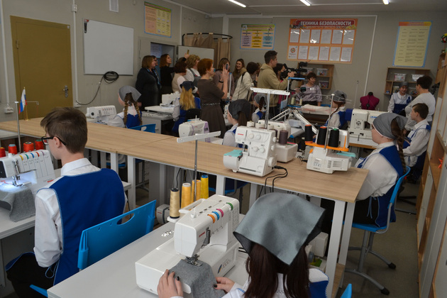 Здесь даже не одна, а две швейные мастерские. И обе отремонтированы и модернизированы. Современное оборудование в одной из них под руководством учителя Евгения Катуновой представили девочки и мальчики (да, мальчики тоже охотно шьют!) из 7-го класса. Дети толково рассказали, что и как они теперь могут сделать на новых электронных швейных машинках.