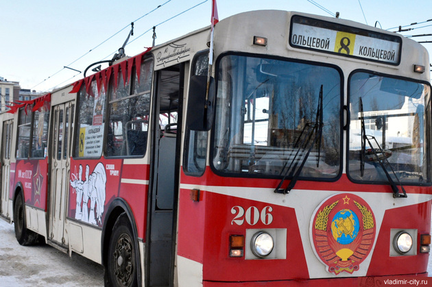 Необычный троллейбус, брендированный в ностальгической советской символике, будет курсировать ближайшие два дня по кольцевому маршруту № 8. “Рогатую” машину марки «ЗиУ-9Г» восстановили сотрудники «Владимирпассажиртранса» с применением оригинальных запчастей и оборудования, заверяют в мэрии областного центра. Именно такие троллейбусы в 80-е годы прошлого века перевозили пассажиров во Владимире.