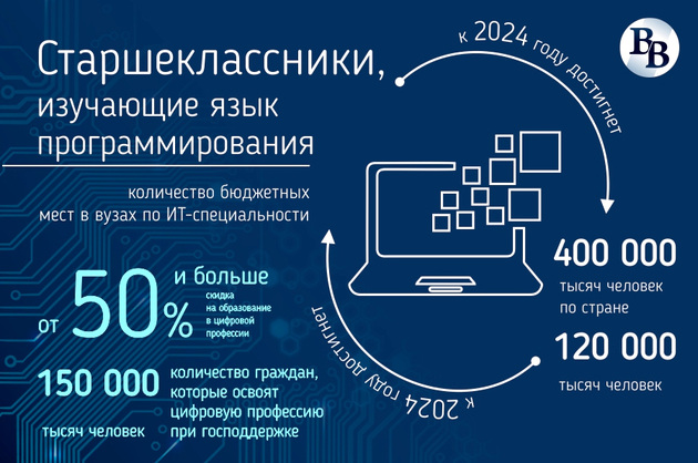 Юрий Зарубин с губернатором согласен. По его словам, к 2024 году количество старшеклассников, изучающих языки программирования, достигнет 400 тысяч человек по стране. При этом количество бюджетных мест в вузах по ИТ-специальности к 2024 году увеличится в полтора раза и достигнет 120 тысяч человек. Амбициозный проект «Цифровые профессии» уделяет внимание не только специальной аудитории, но и любителям. Образование в этой сфере граждане получат с существенной скидкой, начиная от 50% и больше. К 2024 году общее количество граждан, которые освоят цифровую профессию при господдержке, должно составить 150 тысяч человек.