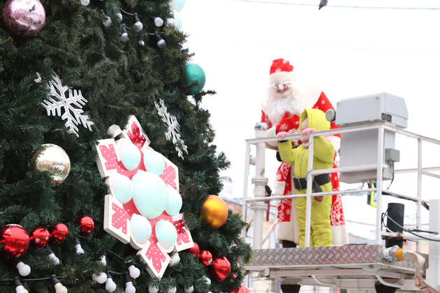 К Дому культуры они пригнали коленчатый подъемник - противопожарную вышку с люлькой и предложили всем желающим с нее украшать елку. Смельчаки нашлись, и под надзором Дедушки Мороза (подозреваем, что он также выходит на службу в МЧС) повесили на ветки несколько украшений. Причем, игрушки ребята принесли с собой, их делали сами.