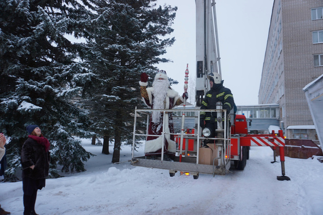 В одно из отделений Дед Мороз тоже поднялся с помощью специального подъёмника, оборудованного коленчато-телескопической стрелой с люлькой. Сотрудники пожарной охраны города помогли ему в этом.