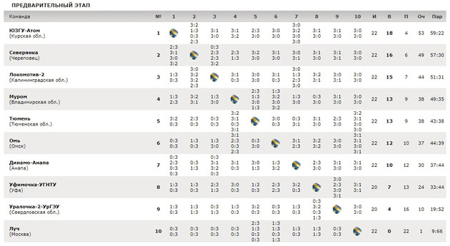 Пока ВК «Муром» по-прежнему держится на 4-м месте, но «Тюмень» и «Омь» подтянулись к нему вплотную. Тройку лидеров составляют «ЮЗГУ-Атом» (Курская обл.), прошлогодний чемпион «Северянка» (Череповец) и «Локомотив-2» (Калининград).