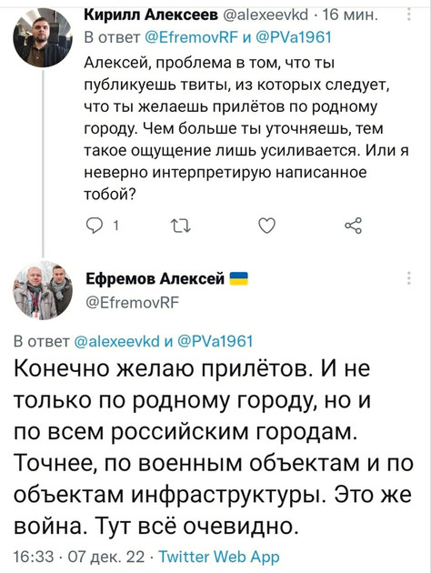 В начале декабря, узнав из новостей об атаке украинского дрона на аэродром в Энгельсе Саратовской области, Ефремов, торжествуя, написал на своей странице «Если до Энгельса достали, то и до Владимира достать реально». На уточняющий вопрос о возможных целях от подписчика, тоже бывшего сотрудника штаба Навального, Ефремов ответил, что был бы не против, если бы ударили по Энергетику. При этом в дальнейшей переписке Ефремов честно признается, что желает «прилетов» не только по родному Владимиру, но и по всем российским городам.
