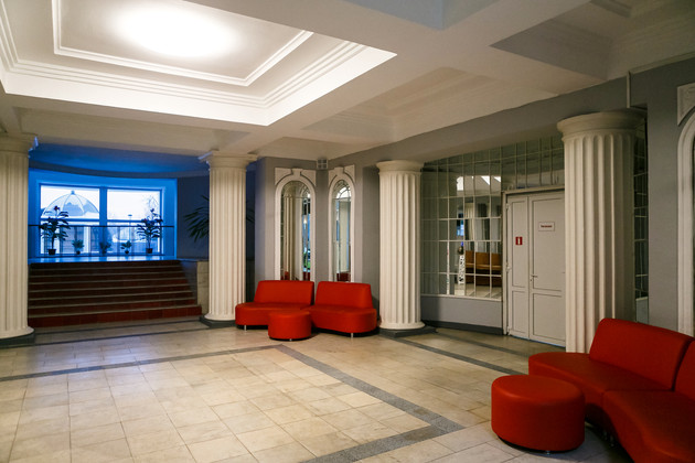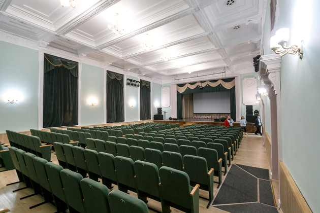 Интересный момент: когда шёл капремонт, встал вопрос, сохранять ли советское оформление этого зала (лепнину и роспись стен). Коллектив сделал всё, чтобы наследие ушедших лет не только не утратили, но и органично вписали в новое оформление.