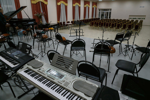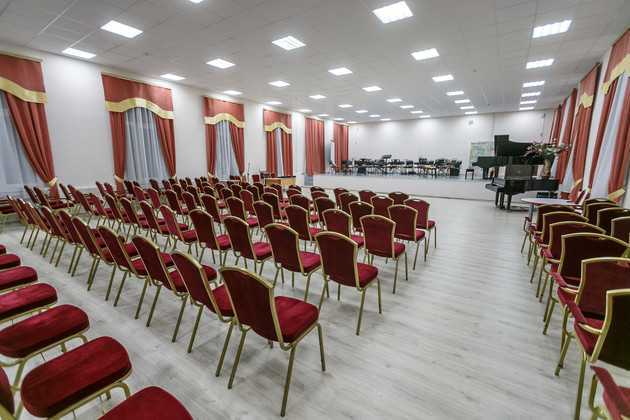 Тут же концертный зал на 150 мест, где постоянно проводят музыкальные вечера, отчётные концерты. Оркестр народных инструментов ставит свои программы. Для удобства музыкантов и их гостей поменяли всё: полы, стены, стеклопакеты, сцену, стулья.