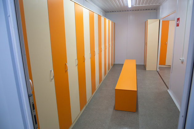 Заходим в спорт-корпус из нескольких модульных блоков. В нем раздевалки, душевые, инвентарная, судейская, специальный модуль для подготовки лыж.