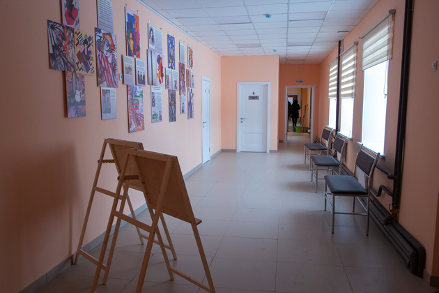Она с улыбкой рассказывает о том, как здесь всё прекрасно. Надежда Алексеевна счастлива, что дети будут учиться в достойных условиях. На первом этаже располагаются актовый зал, гардеробная, художественная школа.