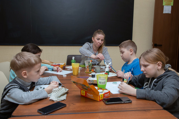 Вместе с Ольгой Владимировной мы заходим в кабинет, где младшая группа школьников лепит фигурки для выставки, посвященной Дню защитника Отечества. Дети практикуются с глиняной, пластилиновой, полимерной массами. По задумке у ребят должен получиться солдат с собакой. Девочка Даша фигурку бойца уже слепила и как раз раскрашивает коричневого пёсика.