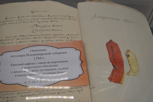 Так что представлено много интересных документов. Они рассказывают о том, как приступил к работе первый наместник граф Роман Воронцов (губерния входила поначалу в состав более обширного наместничества). А вот письмо купцов города Владимира, пославших в подарок наместнику предмет гордости горожан, — владимирскую вишню. Можно увидеть здесь и эскиз красного мундира владимирского чиновника. Здесь и первая почтовая карта губернии, ведь и систему почтовых отделений пришлось налаживать заново в границах новой губернии. Есть и документы о том, как в декабре 1778 года заработали губернские присутственные места с благословения архиерея, и как налаживалась работа магистратов в уездах.