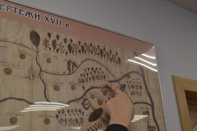 Отдельная большая работа тогда прошла по межеванию границ губерний и уездов. Землемерам пришлось пешком пройти огромные расстояния. До них существовали чертежи XVII века, один из которых, — с изображением территории Юрьевского уезда — тоже представили архивисты. Это большая редкость.