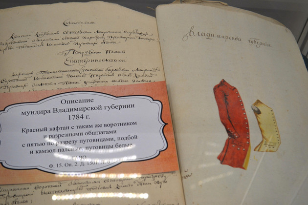 Хранится в архиве и описание мундира чиновника Владимирской губернии, составленное в 1784 году, даже с раскрашенным эскизом костюма. Такой яркий дизайн был тогда предложен: «Красный кафтан с таким же воротником и разрезными обшлагами с пятью по разрезу пуговицами, подбой и камзол палевые, пуговицы белые».