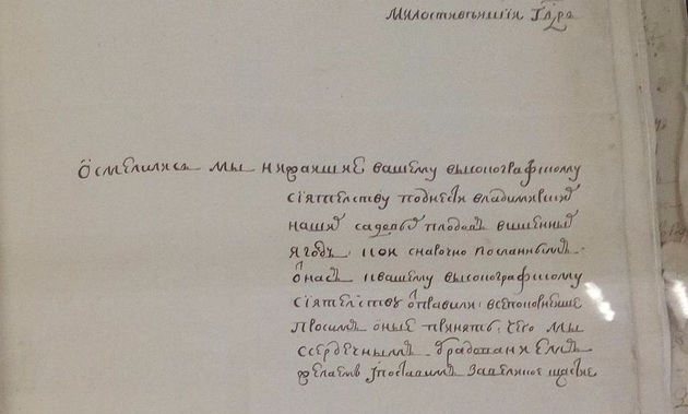 Осмелились мы нижайше вашему высокографскому сиятельству поднести владимирских наших садов плодов - вишенных ягод, кои с нарочно посланным от нас к вашему высокографскому сиятельству отправили. Всепокорнейше просим оные принять, чего мы сердечно обрадованные, посчитаем за великое счастье.