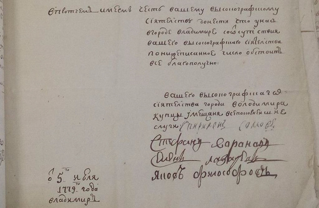 Например, «мозговой штурм» о гербе Суздаля устроили в уездном суде. Идею герба предложил судья Гавриил Иванович Лопухин. И 1 июля 1781 года во Владимирское наместническое правление о городском гербе был направлен вот этот рукописный рапорт, сохранившийся в архиве: